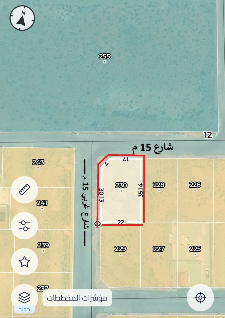 الواجهة : شمالية شارع 15 م وغربية شارع 15 م