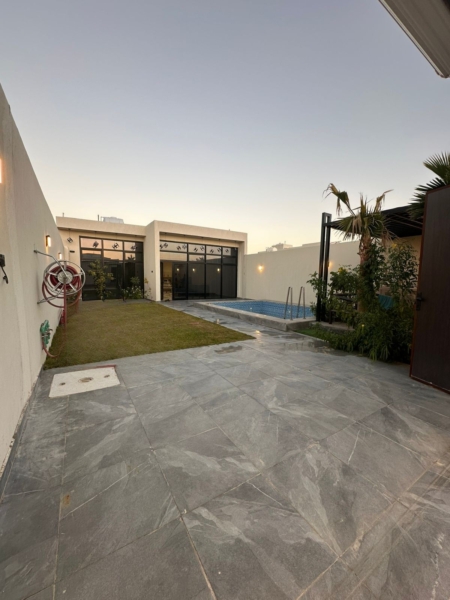 جلسة خارجية+غرفة نوم + صالة + مسطحات + مطبخ + مسبح +دورة مياه +مدخل سيارة+مكيف
